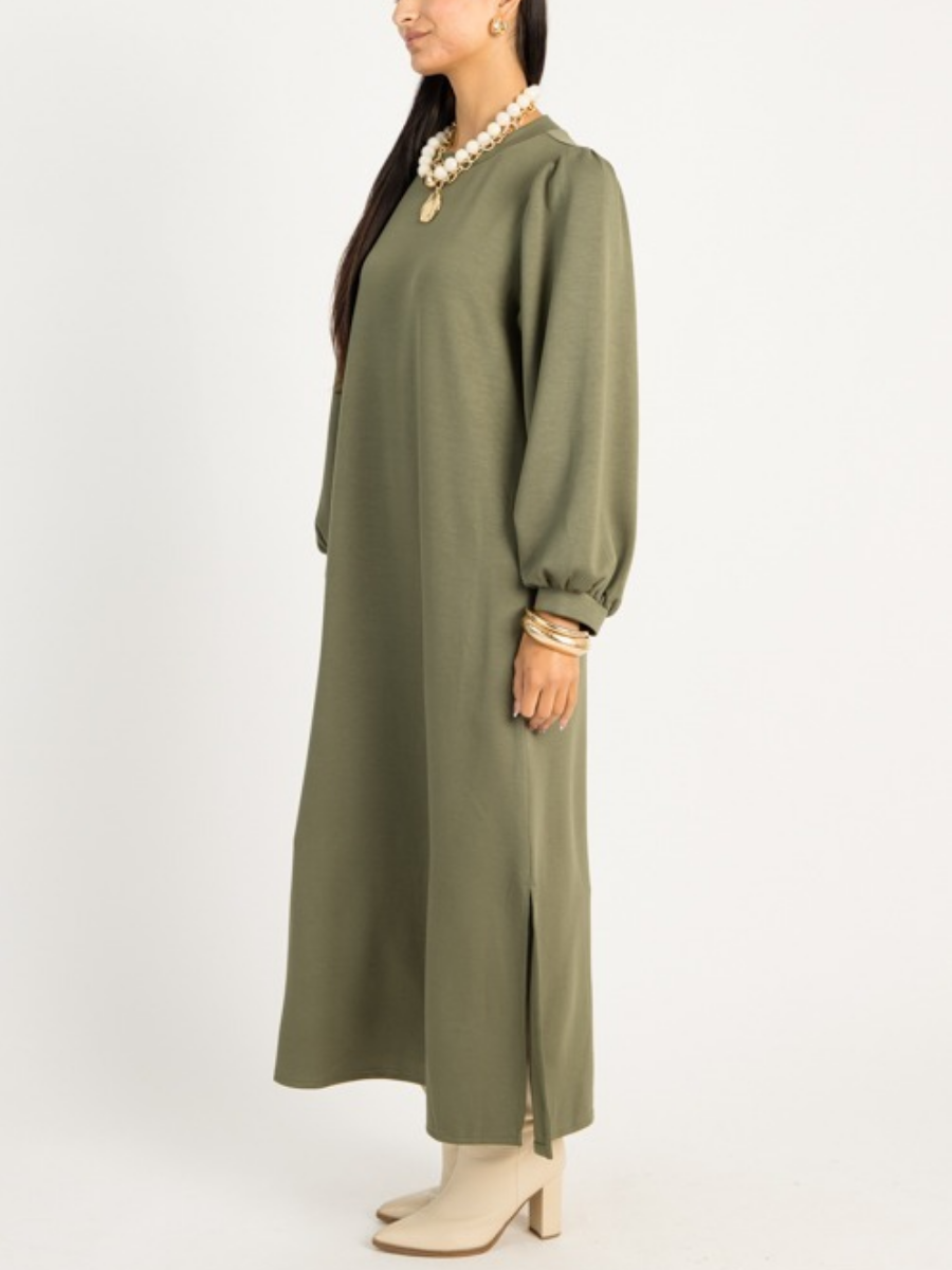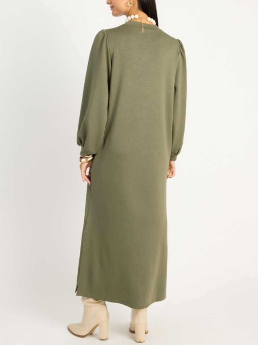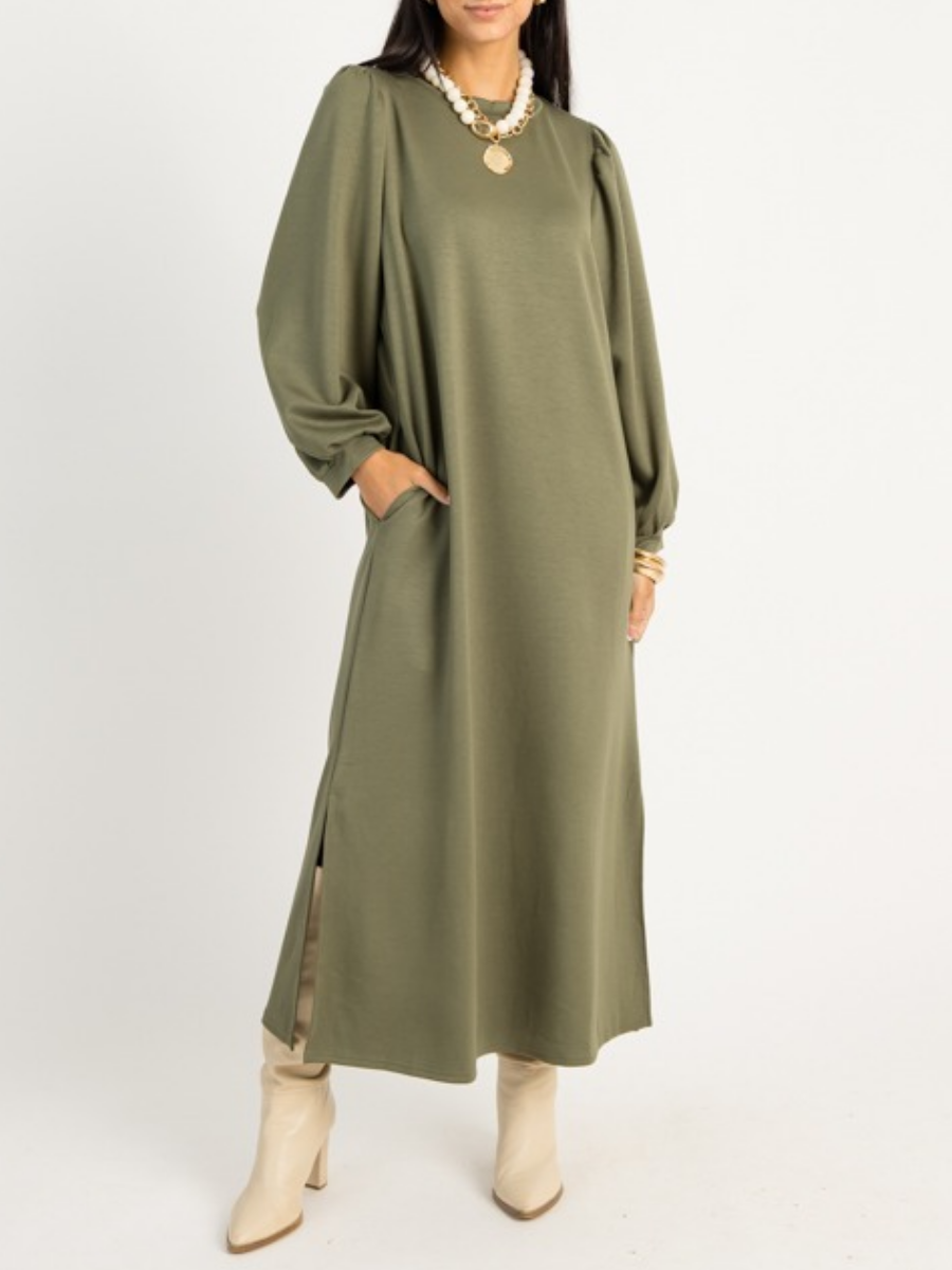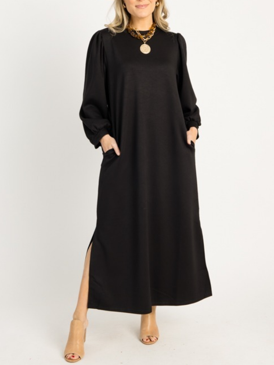 The True Comfort Maxi is your new go-to for effortless style. Crafted from a luxuriously soft fabric that feels smooth against the skin and offers a comfortable stretch, this dress is designed for all-day wear. It features a relaxed silhouette with side slits for easy movement, a classic round neck, and long puff sleeves for a touch of elevated style.