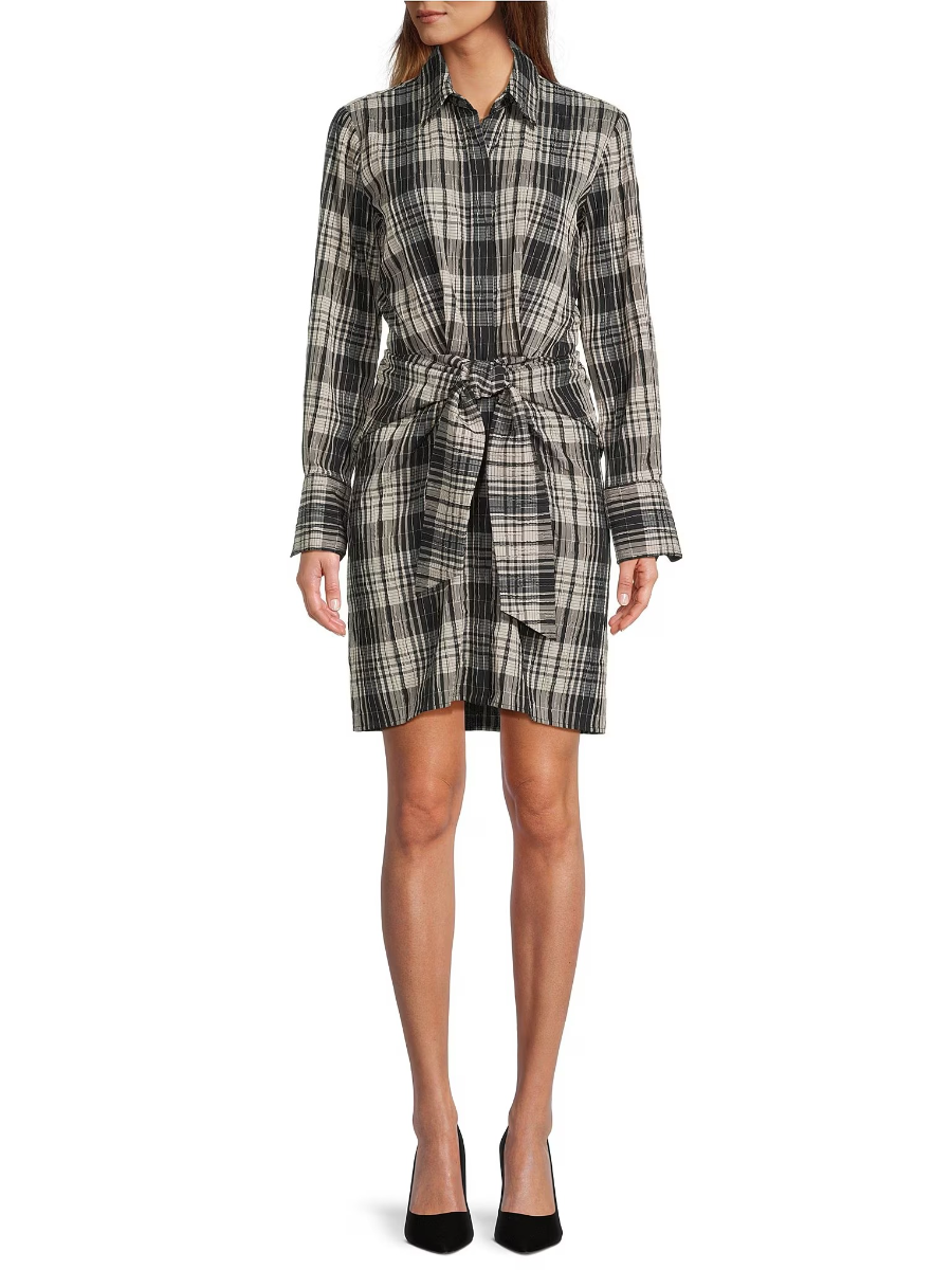 • Long Sleeve Collared Neck Tie Front Shirt Dress