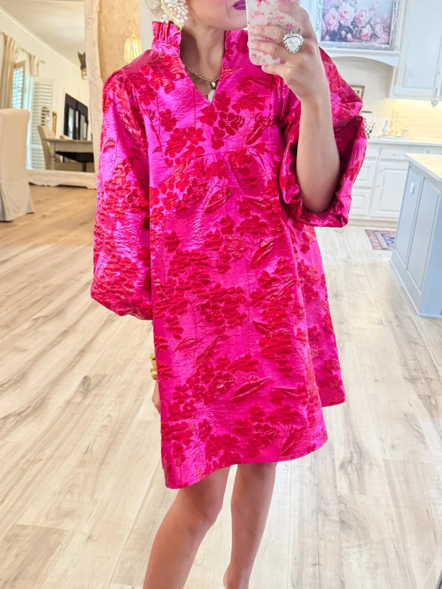 • Hot Pink Ruffle Neck Jacquard Dress