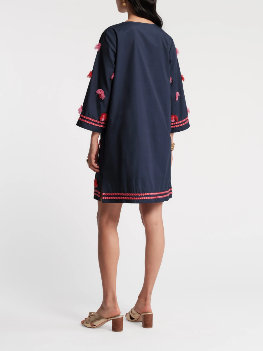 Flower Embroidered Tassel Tie Shift Dress