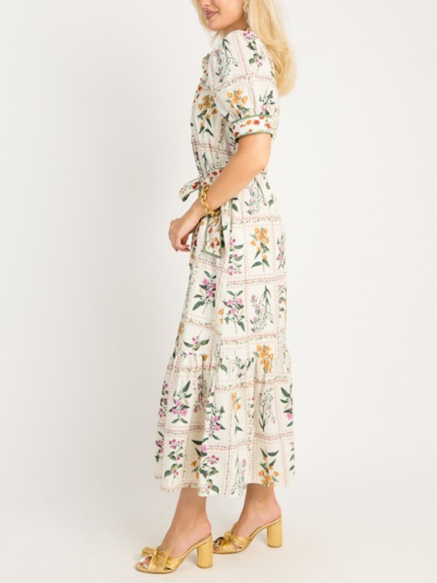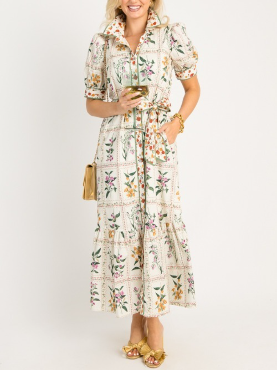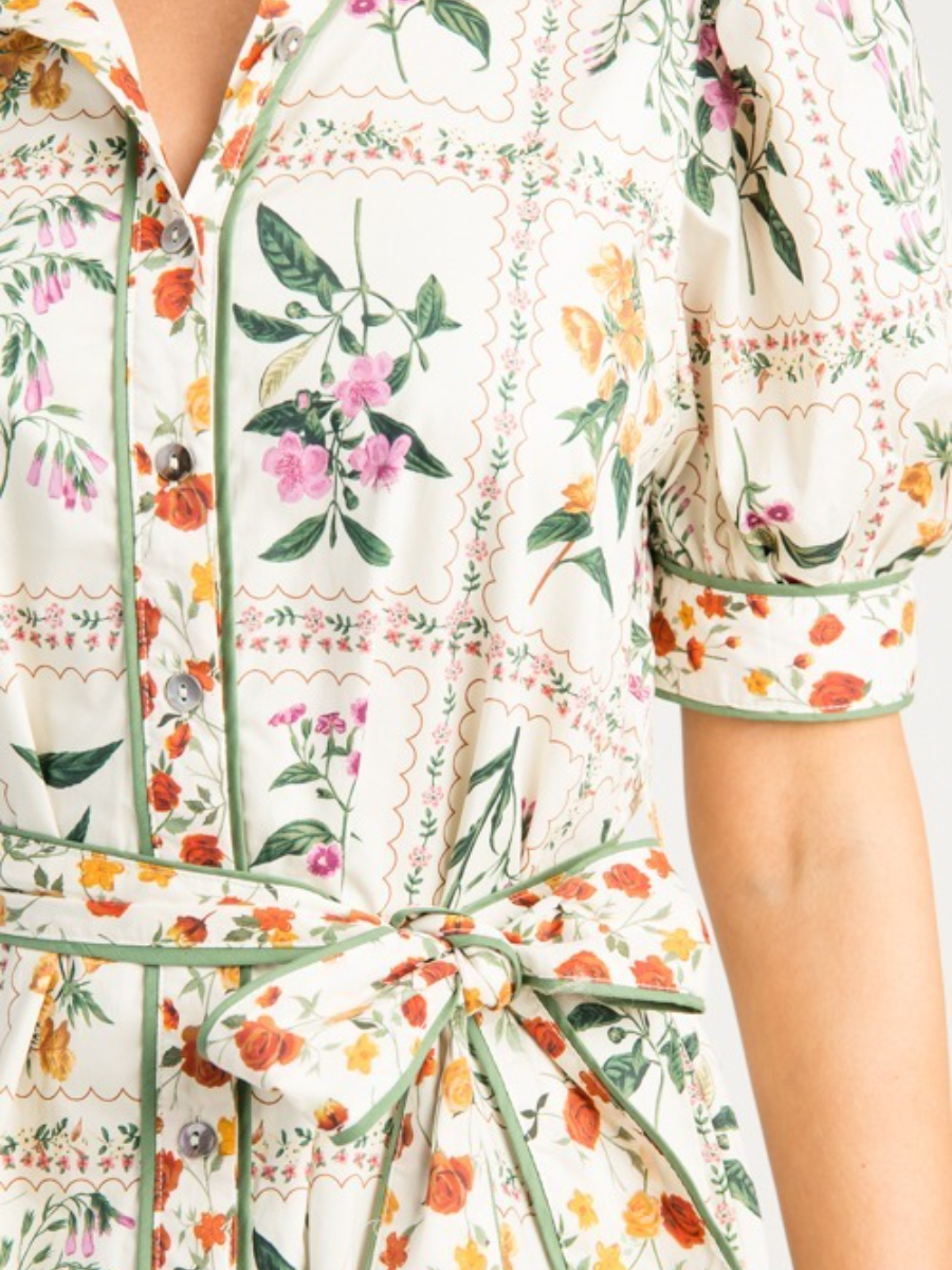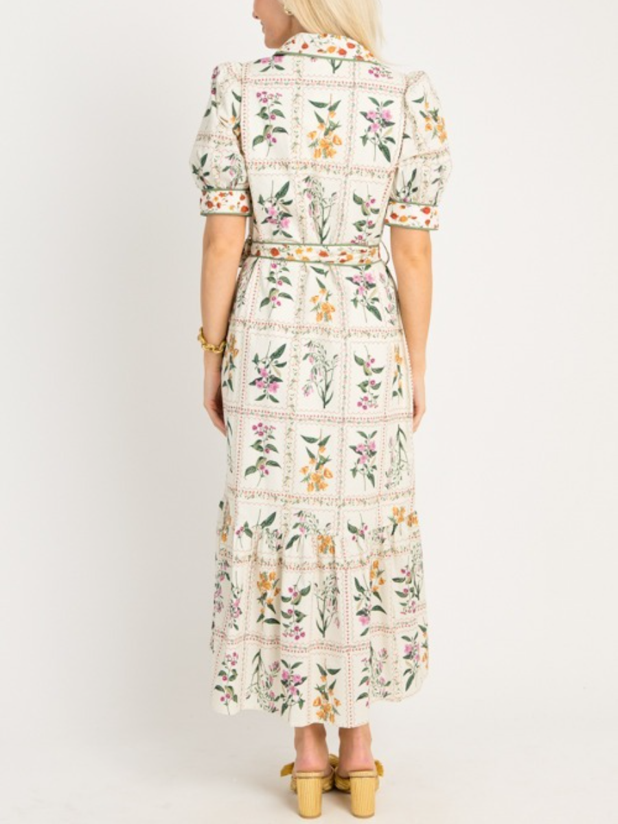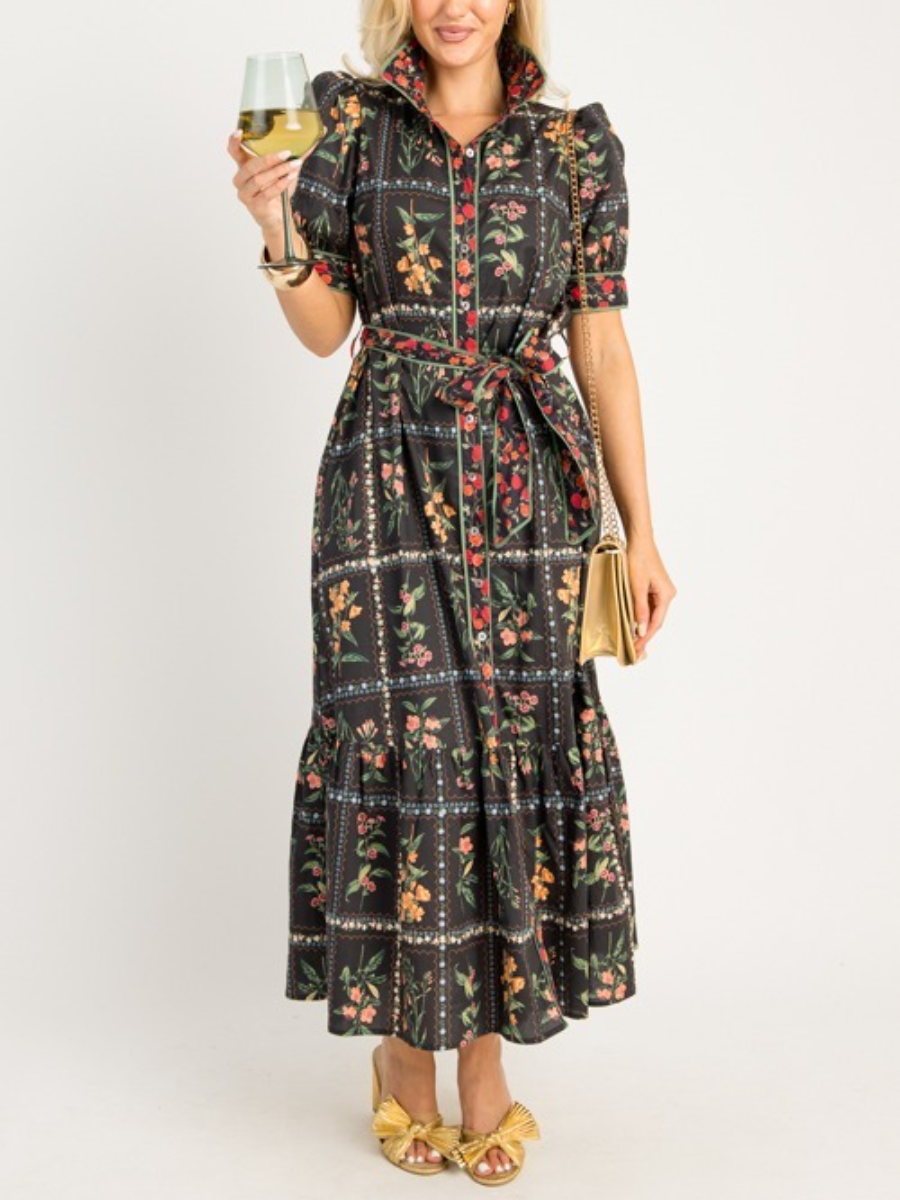 Introducing the Garden Tiles Maxi, a truly feminine and beautiful dress adorned with a fresh floral print. This dress incorporates elements of a classic shirt dress, featuring a timeless collar and a functional button placket down the front. Cinch your waist with the detachable tie belt for a more defined silhouette, or remove it for a relaxed, flowing look. A green binding accent trim provides a sophisticated finish. A playful ruffle hem adds a touch of charm, while short puff sleeves complete the look. also offered in black