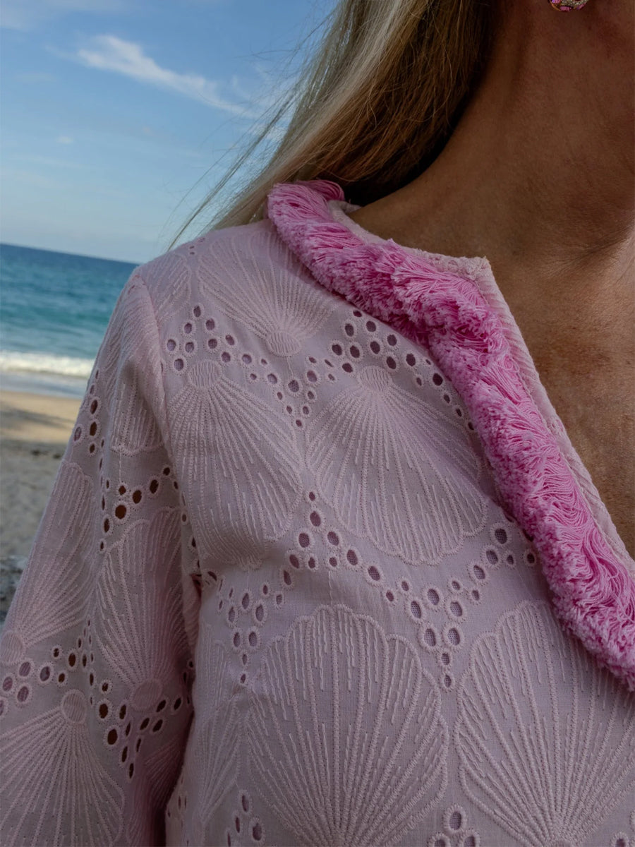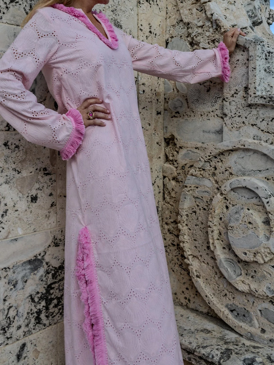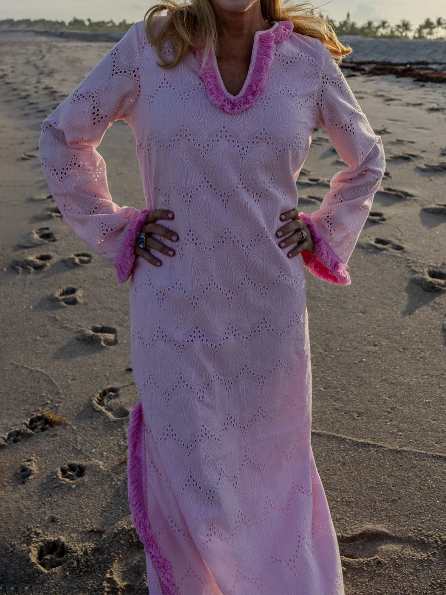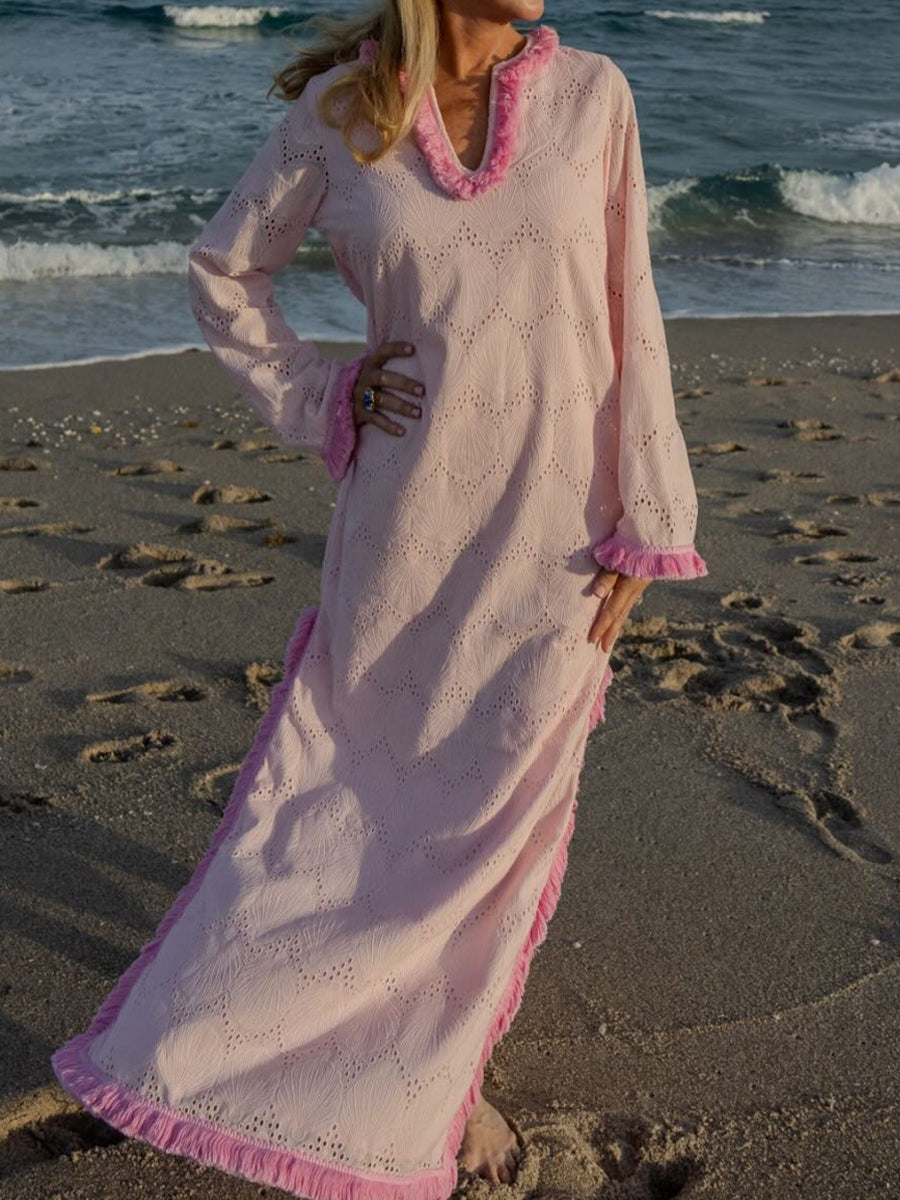 Fringed Trim Eyelet Detailing Silt Hem Maxi Dress